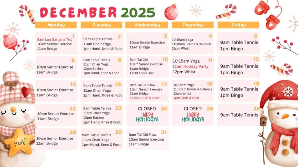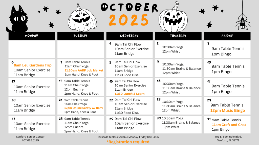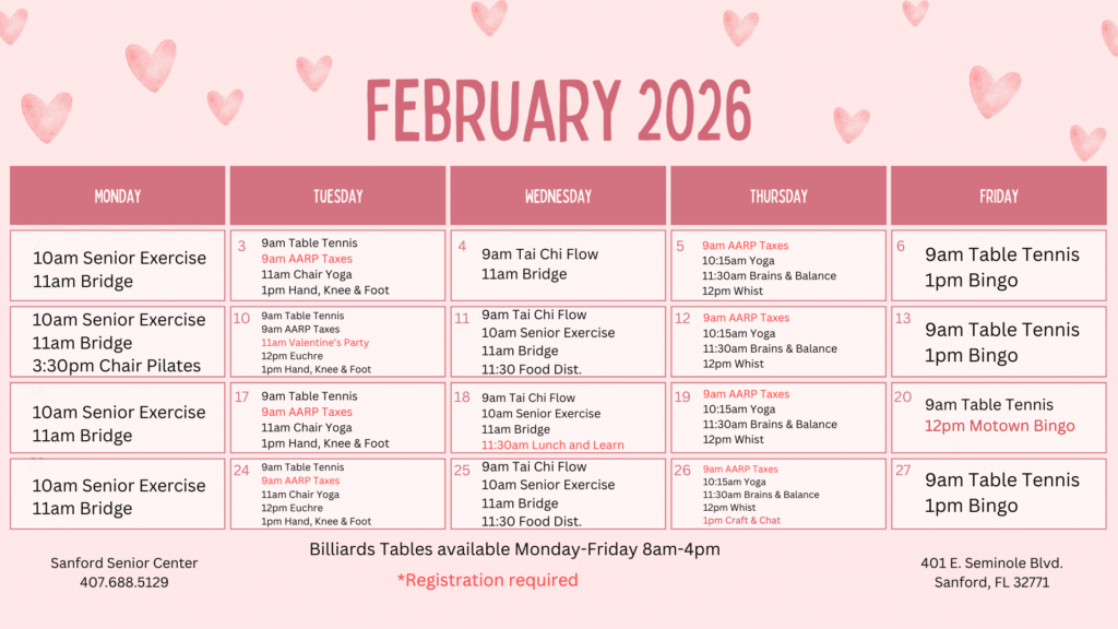 The City of Sanford’s Parks and Recreation Department offers budget-friendly programs and activities for senior adults 55+. See our calendar below for holiday luncheons, fun field trips, crafting classes, exercise classes, and many other engaging and social events that bring people together.